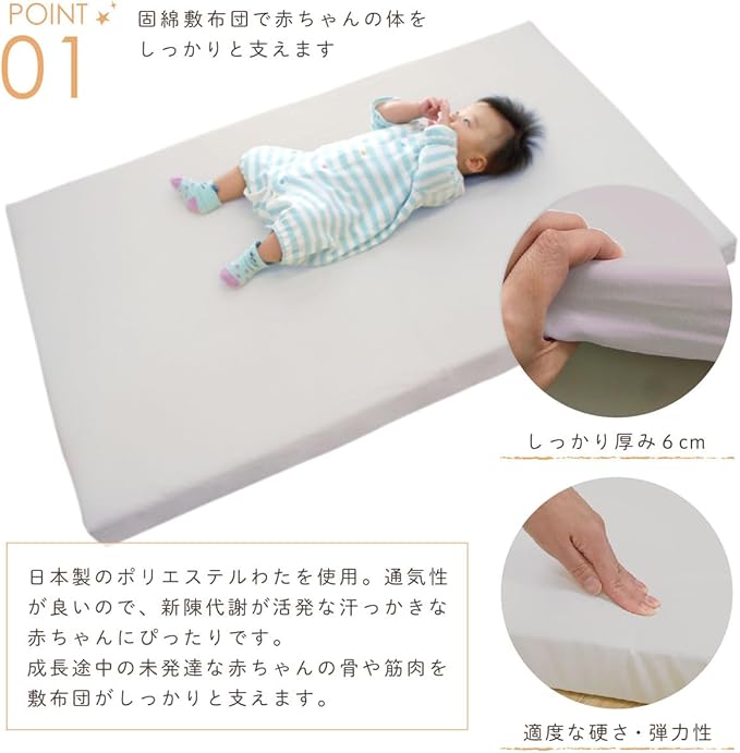 ベビー寝具専門のun doudou(アン・ドゥ・ドゥ)の敷き布団は、適度な硬さで窒息の原因となる体の沈み込みを防ぎ、適度な硬さと弾力性のある固綿敷布団がしっかりと体を支えるので安心です。日本製ポリエステル綿が使用されているのも嬉しいポイントです。